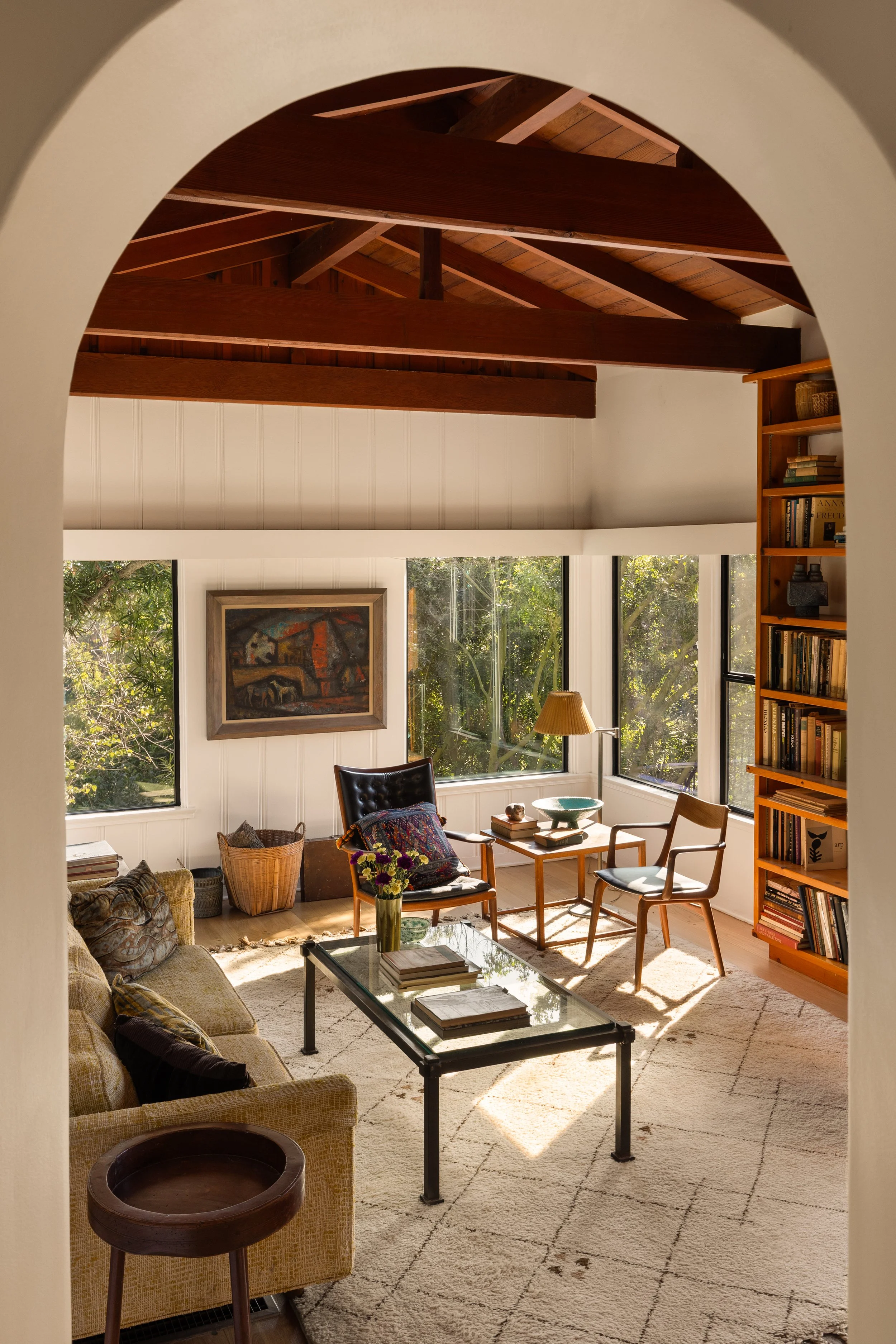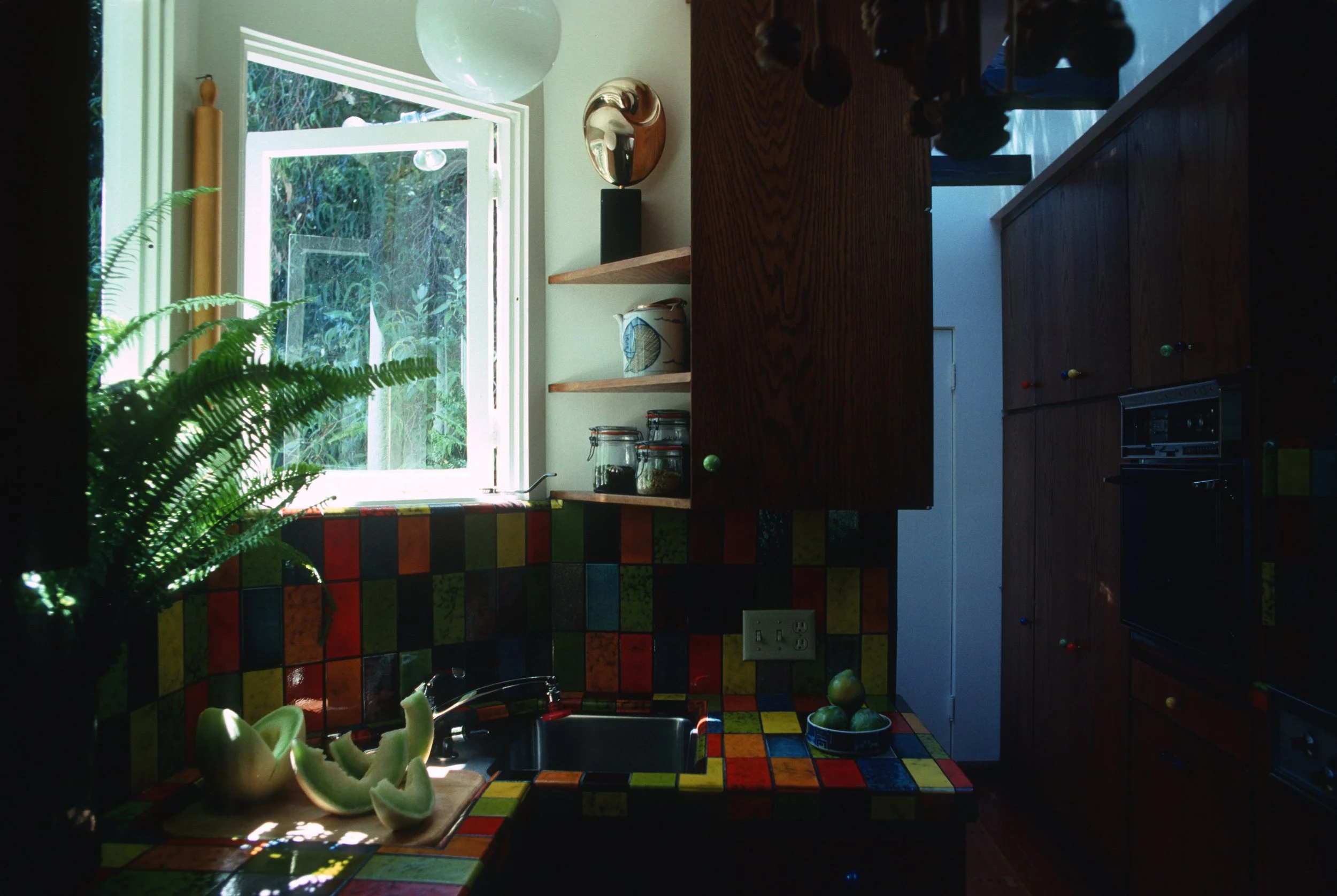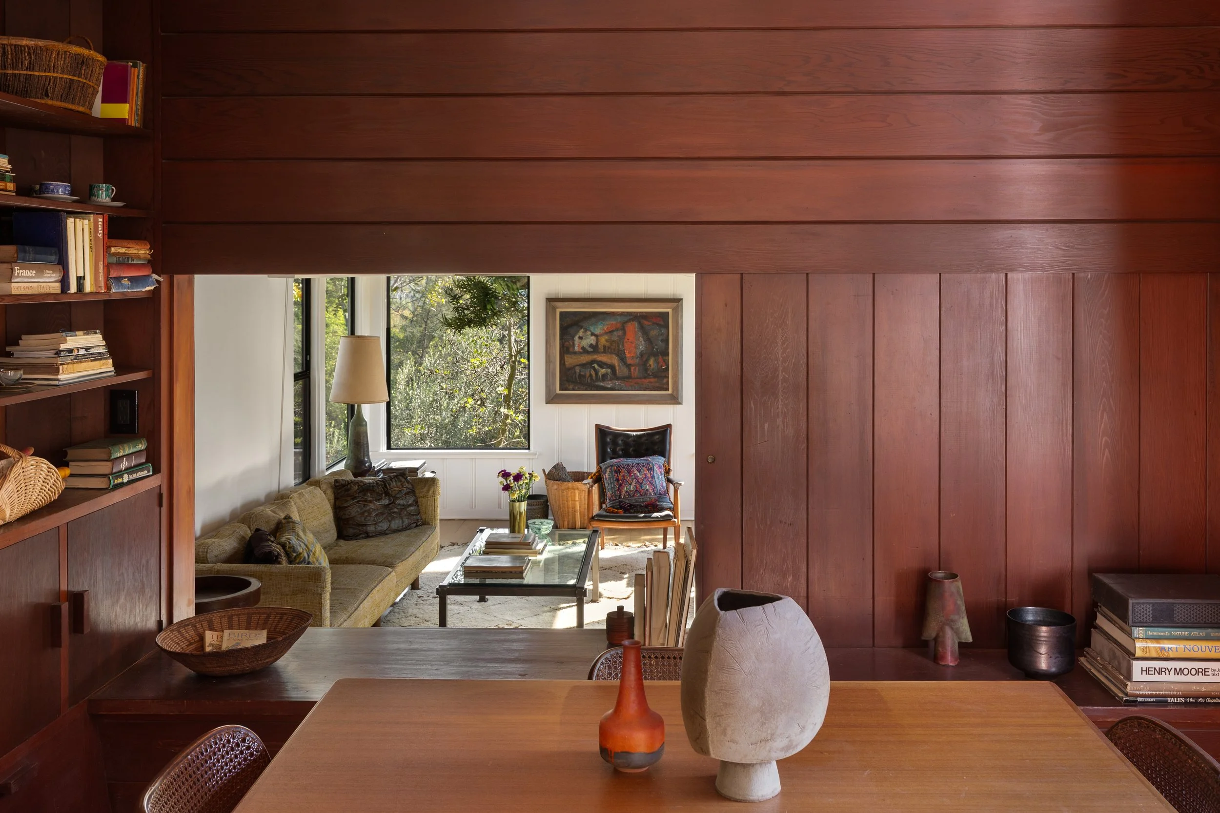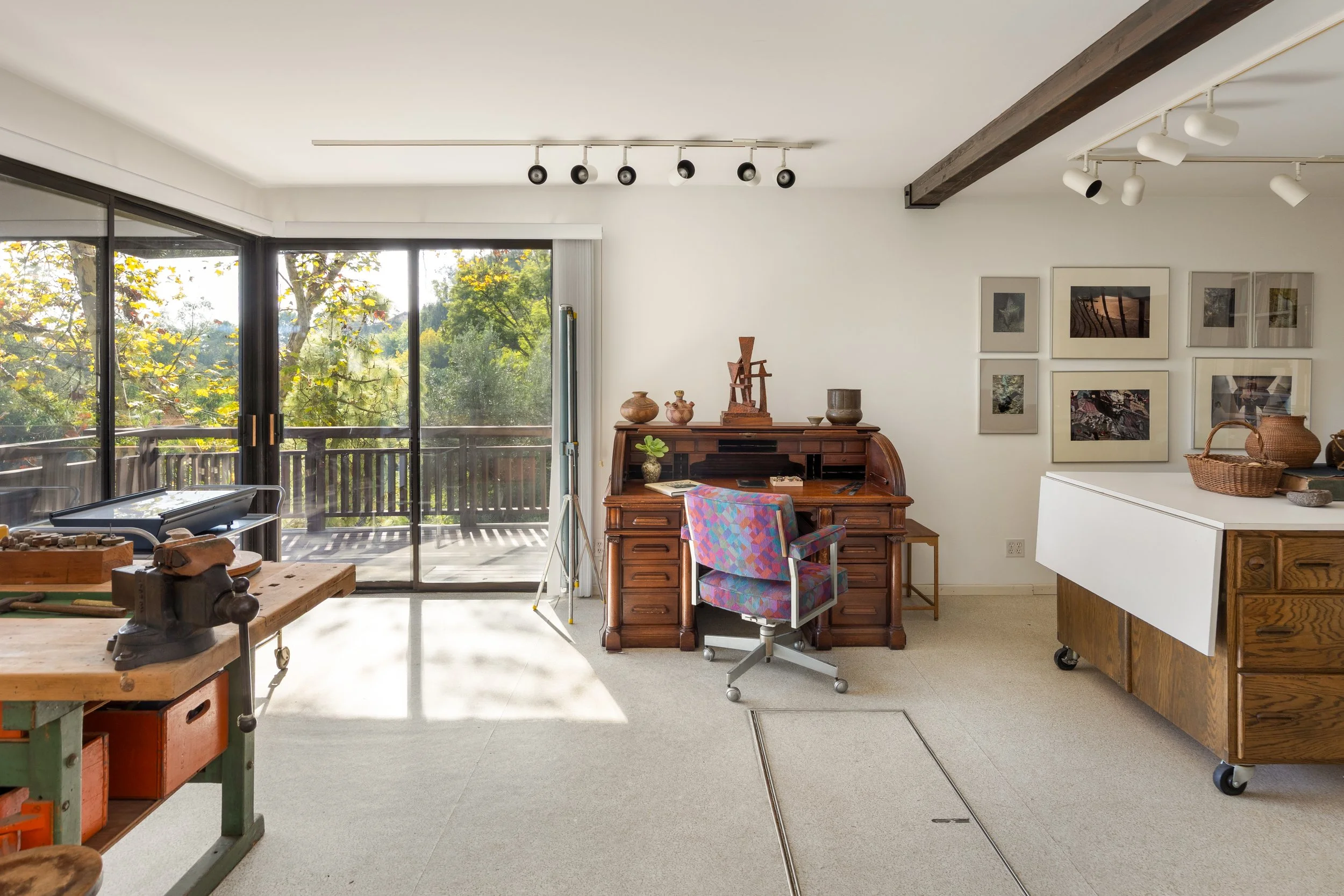 The original house remains intimate and unconventional — a sequence of cozy, character-rich rooms including a living room with fireplace, dining room, and a kitchen with ceramic tiles, many glazed by Otto Natzler. The main residence includes two bedrooms and two and one-half baths; the second bedroom later became Otto’s office following completion of the 1988 addition.